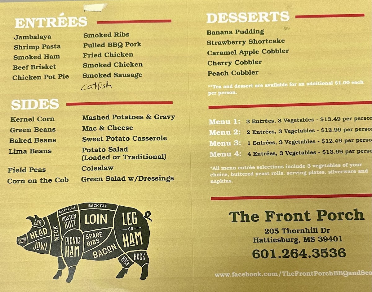 Welcome to The Front Porch BBQ & Seafood, where Southern charm meets culinary delight! Located in the heart of Hattiesburg, this eatery proudly serves a menu brimming with flavor. Diners can indulge in hearty entrées such as Jambalaya, Shrimp Pasta, and perfectly smoked Beef Brisket, each dish reflecting the essence of authentic Southern cooking. Signature favorites like Pulled BBQ Pork and Smoked Ribs are must-tries for any barbecue lover.